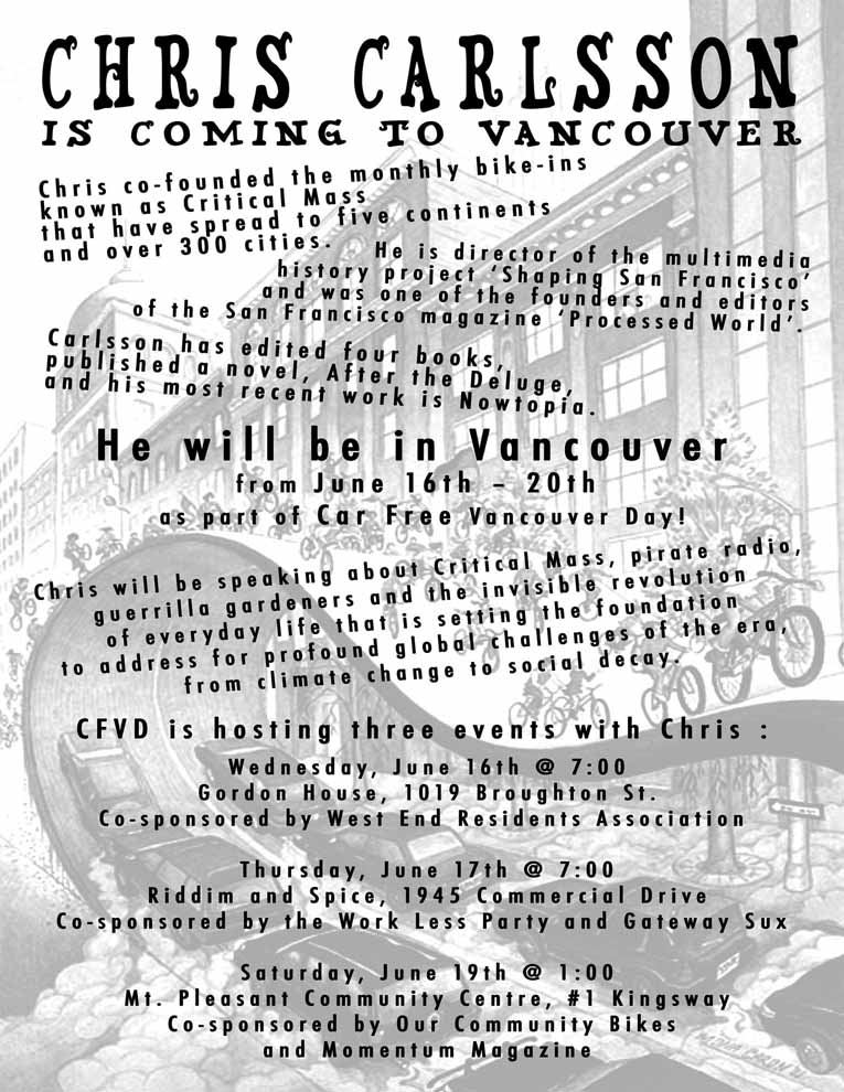 By: For more informationChris co-founded the monthly bike-ins known as Critical Mass that have spread to five continents and over 300 cities. He is director of the multimedia history project Shaping San Francisco and was one of the founders and editors of the San Francisco magazine Processed World. Carlsson has edited four books, published a novel, After the Deluge, and his most recent work is Nowtopia.