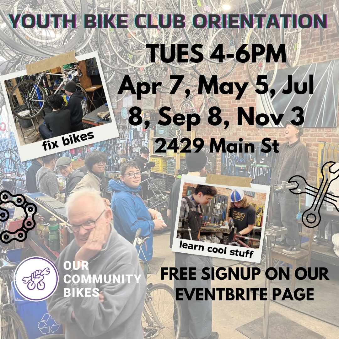 By: Our Community BikesCome hang with us and give our Youth Bike Club a try! If you're between 12-18 and want to learn about bikes by ripping them apart and putting them back together, this could be just the opportunity for you! Sign up for free on our eventbrite page, or just drop in! Guardian consent form on our website, link in bio.